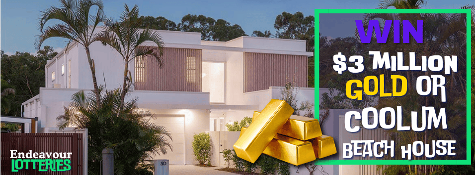 The first prize in Endeavour Draw 466 is the winner’s choice of either a Coolum Beach prize home with a total prize value of $3,000,000 or $3,000,000 in gold bullion.